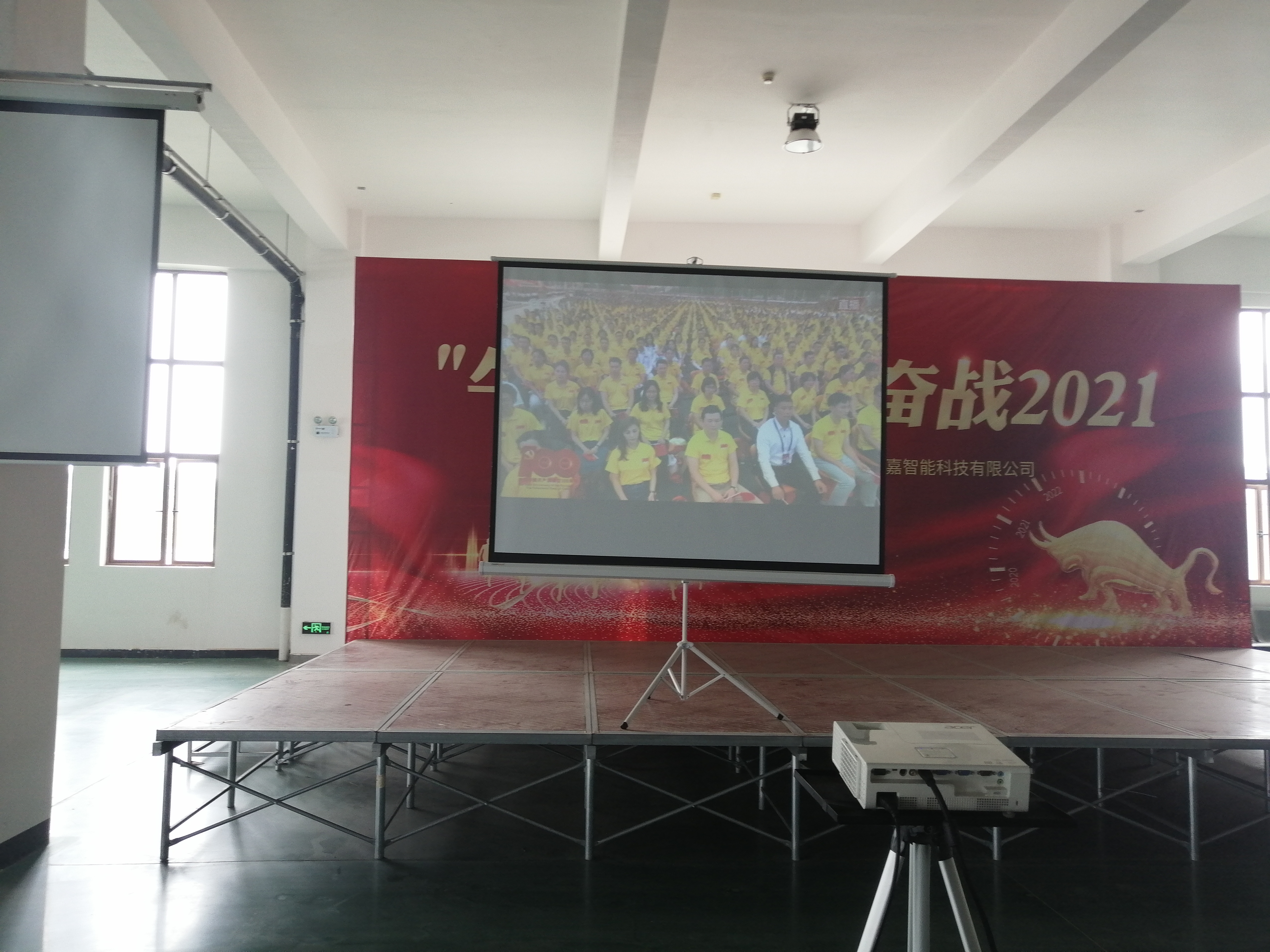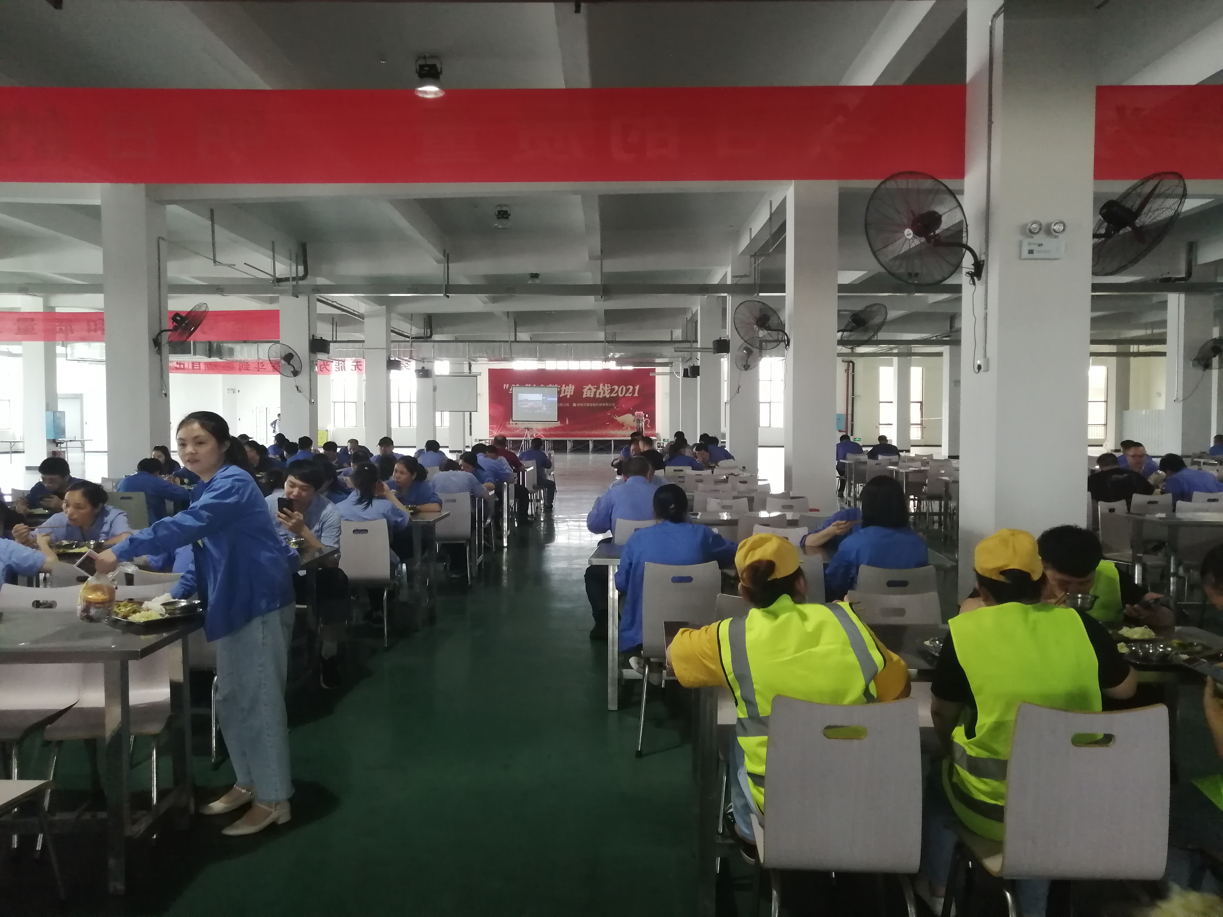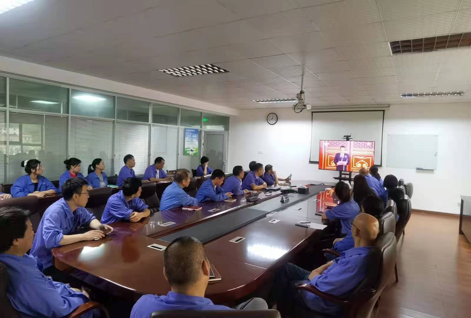 午餐时间,食堂大屏幕回放“100周年大会”视频,员工一边就餐,一边接受精神洗礼,爱国情怀油然而生。