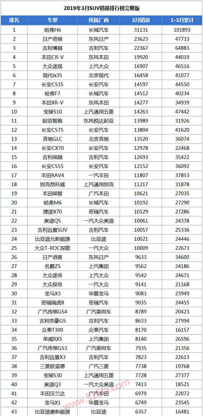 2019年3月SUV销量排行榜出炉了,哈弗H6以31131辆的成绩,轻松夺得本月销量冠军,虽然SUV市场不太景气,但是丝毫不影响哈弗H6这款神车的销量,久经沙场之后,似乎已经练就了一副金刚不坏之身。具体排名如下:
