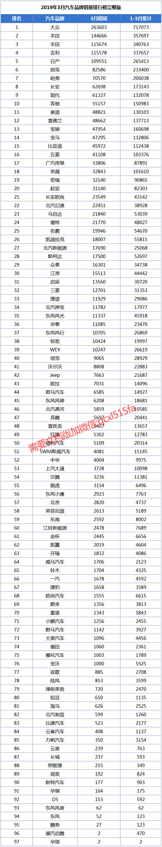 2019年3月汽车品牌销量排行榜完整版出炉了,大众品牌3月销量达到263603辆,再次卫冕销量冠军。本田品牌3月销量达到144666辆,排名第二,表现十分强势。具体排名如下: