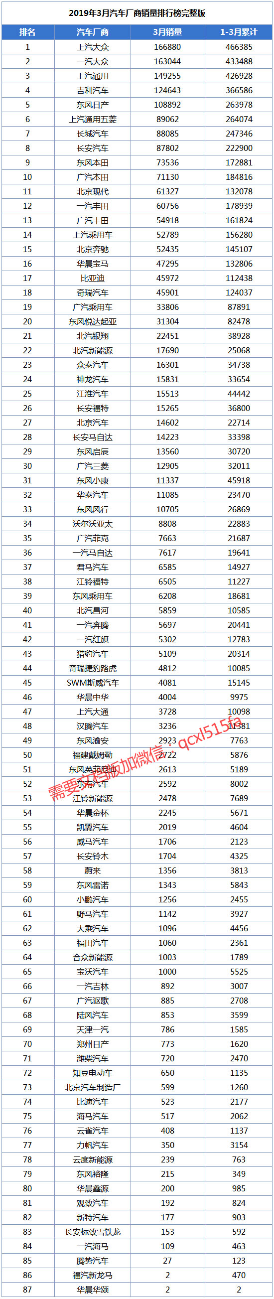 2019年3月汽车厂商销量排行榜